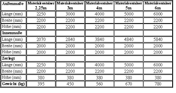 Die Schnellbau-Materialcontainer produzieren wir in der Längen 2,25m, 3m, 4m, 5m a 6m. Die Breite des Containers ist 2,2 m und die Höhe auch 2,2 m.